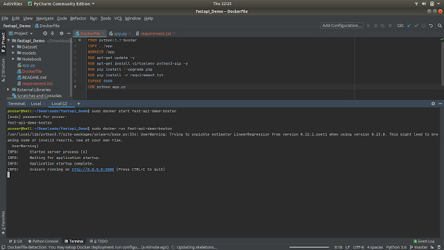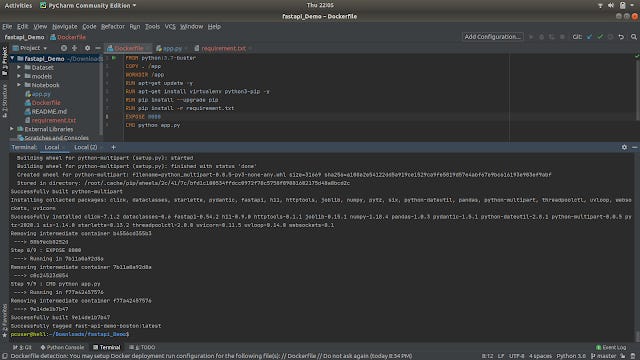 EXPOSE 8000CMD python app.pyLet’s see what our Dockerfile does. FROM python:3.7-buster pulls python 3.7’s image from the docker hub, COPY command copies the fast api app into the container and WORKDIR command sets the working directory. RUN apt-getget update -y ,makes the environment up to date and the next command "RUN apt-get install virtualenv python3-pip -y"we are creating a virtual environment to run this app, the next command "RUN pip install --upgrade pip" helps to upgrade the package manager to the latest version. “RUN pip install -r requirements.txt” this command will install each requirement written in “requirements.txt ” file one by one bye on the host system. EXPOSE as the name says exposes port 8000 which Fast api app will use to the container so that later it can be mapped with the system’s port. Entrypoint and CMD together just execute the command “python app.py” which runs this file.